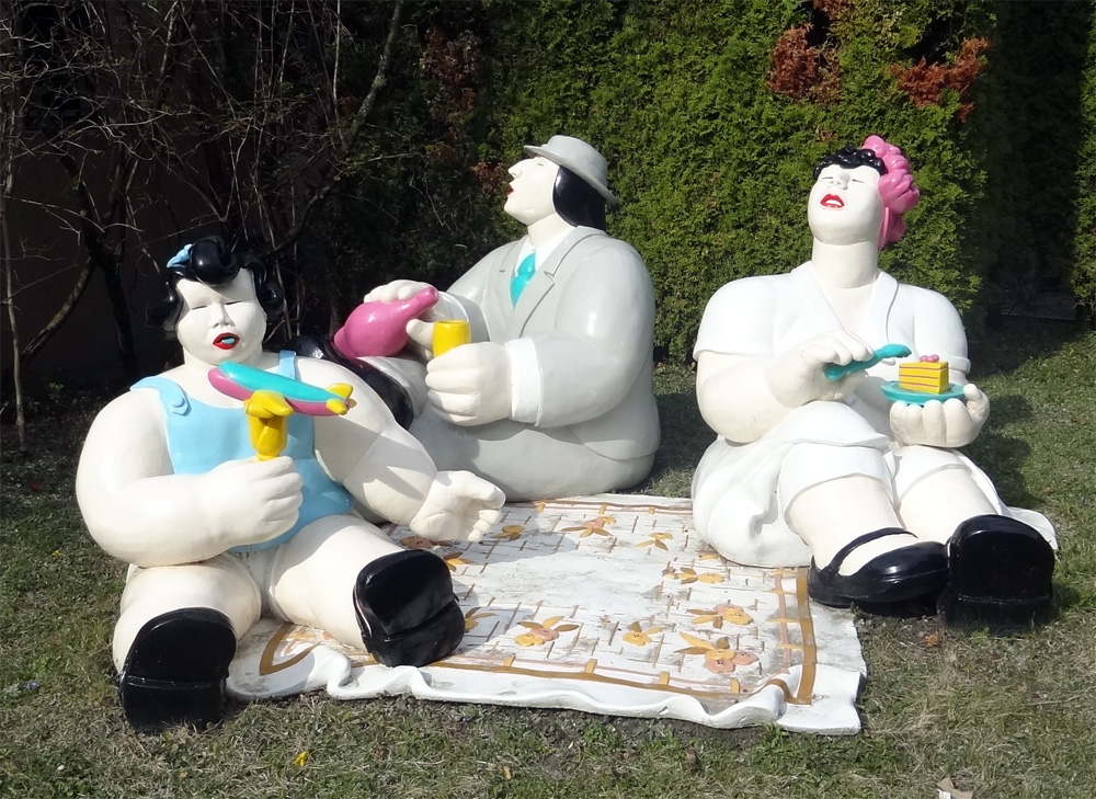 3 personnages et une nappe en polyester peint l’homme 110 x 130 x 90 cm; la femme 110 x 120 x 90 cm l’enfant 90 x 90 x 100 cm; …